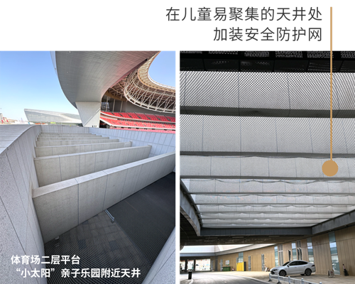 快樂(lè)成長(zhǎng),安全為先。為了確保兒童游樂(lè)區(qū)的安全,鄭州奧體中心從細(xì)節(jié)處著手精心加裝了多種防護(hù)裝置,在奧體中心西北角區(qū)域加裝隔離花箱、石墩,確保行人與機(jī)動(dòng)車分離。同時(shí),在體育場(chǎng)二層平臺(tái)兒童聚集較多的天井內(nèi),加裝防護(hù)網(wǎng);在健身器材一側(cè)加裝防護(hù)欄;在通往二層平臺(tái)的步梯兩側(cè)加裝防滑球......這些防護(hù)裝置均經(jīng)過(guò)嚴(yán)格的現(xiàn)場(chǎng)論證和質(zhì)量檢測(cè),確保其具有優(yōu)異的耐用性和穩(wěn)定性。通過(guò)這些措施,鄭州奧體中心致力于為孩子們打造一個(gè)既充滿樂(lè)趣,又安全無(wú)虞的游樂(lè)環(huán)境。
