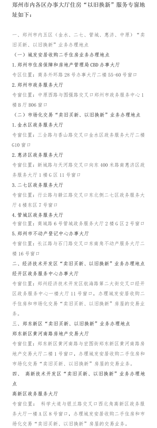 7月16日,記者從鄭州市房管局獲悉,為促進(jìn)該市房地產(chǎn)市場“賣舊買新、以舊換新”政策進(jìn)一步落實(shí),鄭州市房管局會同稅務(wù)、不動產(chǎn)登記等部門,認(rèn)真梳理工作流程、全面開設(shè)服務(wù)專區(qū),全力推進(jìn)住房“以舊換新”工作。目前,鄭州市內(nèi)8區(qū)10個辦事大廳均開設(shè)“以舊換新”服務(wù)專窗,辦理相關(guān)業(yè)務(wù)可享受“專人專窗”的服務(wù)。