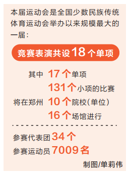 據(jù)競(jìng)賽表演部相關(guān)負(fù)責(zé)人介紹,本屆民族運(yùn)動(dòng)會(huì)競(jìng)賽表演共設(shè)18個(gè)單項(xiàng),馬上項(xiàng)目比賽已于7月12日至17日在呼和浩特圓滿(mǎn)結(jié)束,其他17個(gè)單項(xiàng),131個(gè)小項(xiàng)的比賽將在鄭州10個(gè)院校(單位)、16個(gè)場(chǎng)館進(jìn)行;參賽代表團(tuán)34個(gè),參賽運(yùn)動(dòng)員7009名,是全國(guó)少數(shù)民族傳統(tǒng)體育運(yùn)動(dòng)會(huì)舉辦以來(lái)規(guī)模最大的一屆。另外,本屆運(yùn)動(dòng)會(huì)還將突出河南省武術(shù)大省的優(yōu)勢(shì),“少林拳”和“陳氏太極拳”等也將一一呈現(xiàn)。