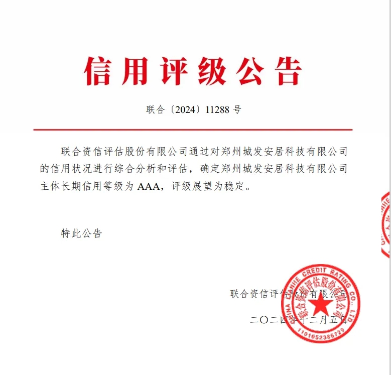 12月5日,鄭州城市發(fā)展集團(tuán)有限公司下屬子公司鄭州城發(fā)安居科技有限公司(以下簡稱安居科技)順利取得AAA主體信用評(píng)級(jí),評(píng)級(jí)展望為“穩(wěn)定”,成功邁入國內(nèi)企業(yè)信用等級(jí)第一梯隊(duì)。