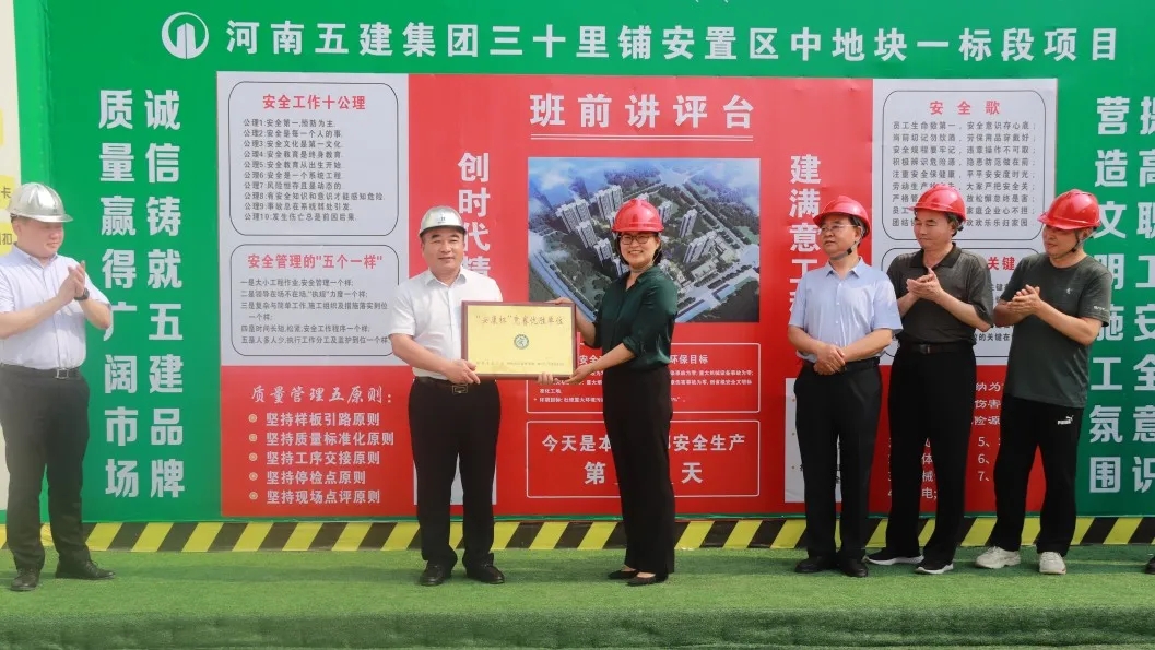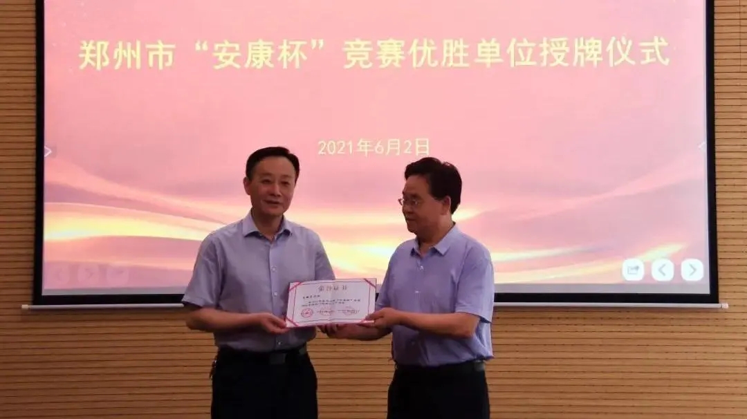 6月2日下午,鄭州市總工會(huì)機(jī)關(guān)工會(huì)主任王銀倉(cāng)、市總工會(huì)勞動(dòng)和經(jīng)濟(jì)部部長(zhǎng)宋慧分別向集團(tuán)兩家獲獎(jiǎng)公司頒發(fā)鄭州市“安康杯”競(jìng)賽優(yōu)勝單位獎(jiǎng)牌。