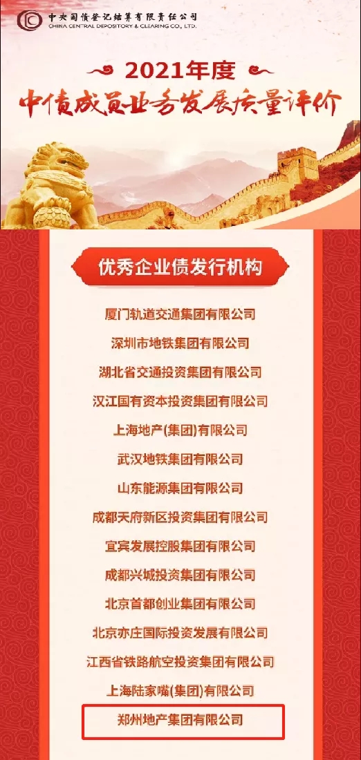 2022年1月4日,鄭州地產(chǎn)集團獲評中央國債登記結(jié)算有限責任公司(以下簡稱中央結(jié)算公司)發(fā)布的2021年度中債成員業(yè)務發(fā)展質(zhì)量評價“優(yōu)秀企業(yè)債發(fā)行機構(gòu)”。